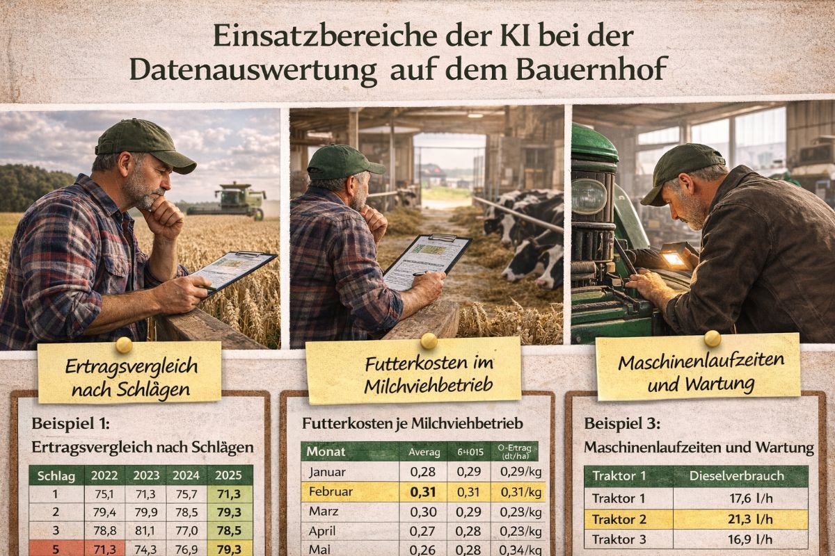 In jedem Betrieb sammeln sich Daten: Ernteerträge, Maschinenlaufzeiten, Futterverbräuche, Dieselkosten. Doch die Zahlen liegen oft verstreut in Tabellen, Ordnern und verschiedenen Programmen – und bleiben dort ungenutzt. KI kann diese Daten durchsuchen, Muster erkennen, Schlussfolgerungen ableiten und Handlungsempfehlungen liefern. Was das in der Praxis bedeutet und wo die Grenzen liegen, zeigt dieser Beitrag.