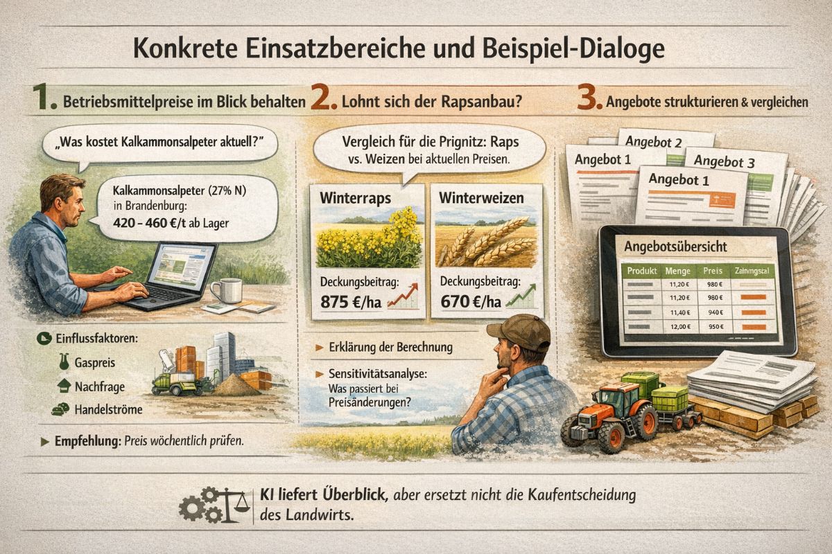 Für den Anwendungsfall „Marktpreise recherchieren und kalkulieren“ kann eine KI-Lösung wie Landwirt.ai zum Beispiel: